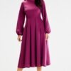 A midi length blouson dress with long sleeves finished with an elastic band. Fastened at the back with a covered zipper. Elegant, with a boat neckline and fitted top, it is an ideal choice for all kinds of meetings.