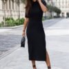 Knitted dress with a straight cut with a feminine leg cutout. The dress has a fitted cut, but not form-fitting. Made of natural, high-quality knit fabric without lining. Leah dress can be worn for many occasions. The classic cut combined with stilettos will create a look perfect for special occasions. Worn with boots/boots or flip-flops it will work well in casual styling. Dress designed and sewn in Poland.
