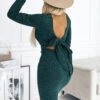 Sweater dress with long sleeves, back neckline and bow tie. Made of sweater-like warm material in green color. Polish product. Brand numoco.