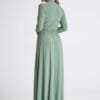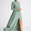 A maxi dress, with a turtleneck and long sleeves. The top of the dress is fitted, with a crinkle at the waist. From the waist down it is flared with a break in the front.