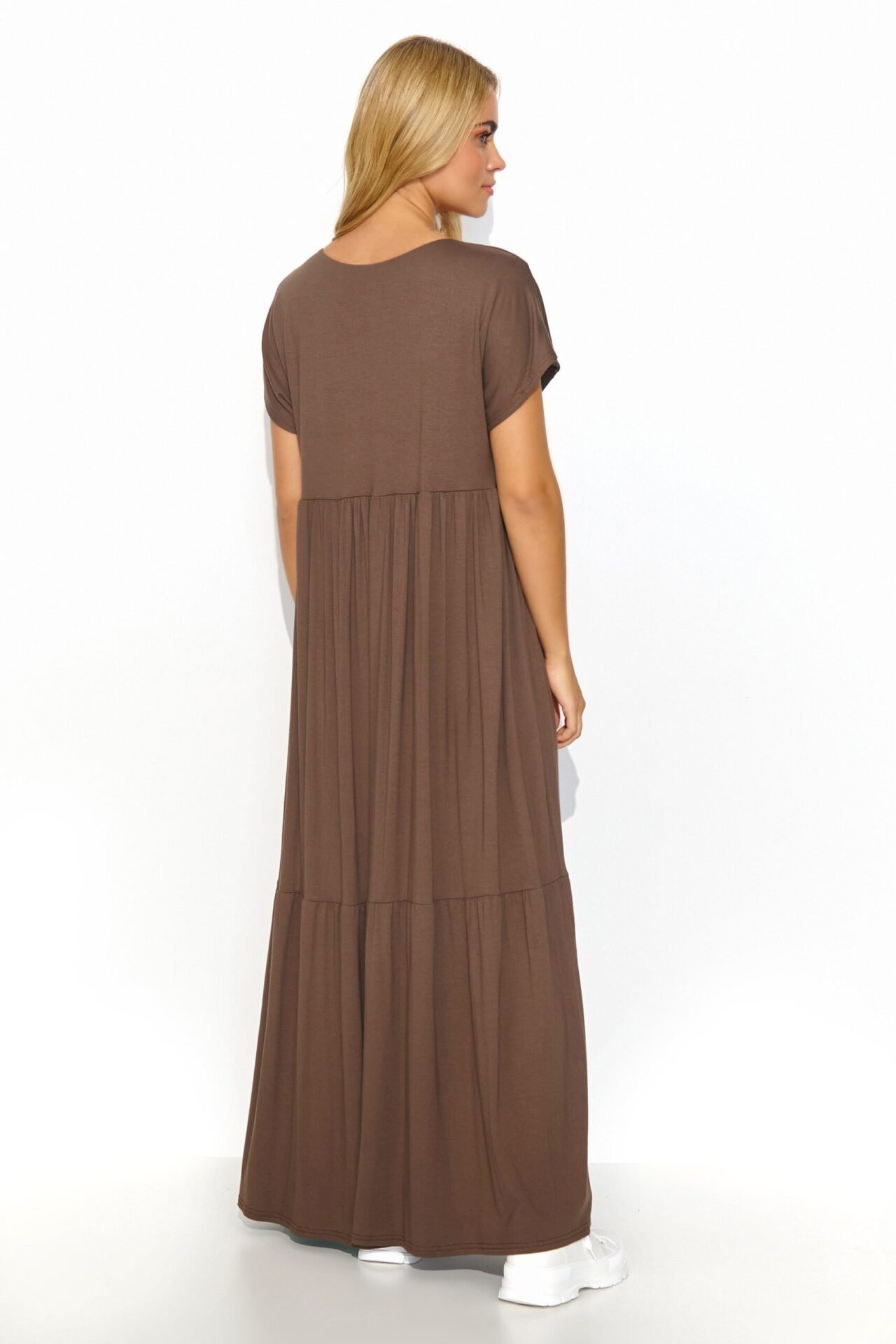 Viscose dresses are airy, casual and still very fashionable. Our maxi dress with a loose cut has stitching in two places creating a striking crease. The V-cut neckline beautifully exposes the bust and collarbones. An additional advantage is the sewn-in minimalist gold-plated plate on the back of the dress. This model is an excellent proposal for casual styling, which you can complement with sports shoes, sandals or boots. Women who appreciate casual style, comfort and timelessness will certainly love this dress.