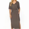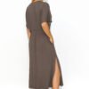 Loose midi dress is an ideal choice for summer days, providing not only comfort, but also freedom of movement and lightweight wear. Made of lightweight knit fabric, the dress is pleasant to the touch and provides comfort all day long. The casual short sleeve gives the dress a casual feel, while emphasizing its girly style. There is a drawstring waist, which adds lightness to the dress and gently accentuates the waist. On the front, the dress is decorated with a gold bling, which adds to its elegance and unique glamour. The slit at the bottom of the dress adds a touch of extravagance to the creation, making it more practical and spectacular. Available in a variety of colors, such as taupe, olive, earthy brown, denim, black and beige, this dress allows you to choose a shade to suit every taste and style. It’s ideal for a variety of occasions, from casual strolls to evening gatherings with friends.