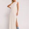 This knit dress is an expression of luxury and exceptional Polish tailoring, where attention to detail and comfort come together in one design. Designed and sewn in Poland, it represents unique style and wearing comfort. The oversize dress is an excellent choice for women who value freedom of movement without sacrificing elegance. Its cut, worn over the head, makes it extremely easy and comfortable to wear. The slit on the side adds lightness and subtle sensuality to the dress. The sleeveless design of the dress, supported by shoulder pads, adds a modern and unique touch to the whole look. The shoulder cushions add structure while emphasizing the unique shape of the dress. The maxi length makes the dress suitable for both elegant outings and more casual occasions. The decorative logo-embellished plaque placed on the back is not only a design element, but also a subtle accent that enriches the entire design. The careful workmanship of the tinsel emphasizes the high quality of the dress. In addition, the lack of lining makes the dress airy and lightweight, ideal for warmer days. This knit dress is not just a garment, but an expression of Polish tailoring tradition, combining elegance, comfort and unique design. Ideal for women who want to express themselves through fashion, emphasizing their individual style.