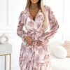 Chiffon dress with ruffle, neckline, long sleeve and belt. Dress made of beige floral fabric. Brand numoco basic. European production.
