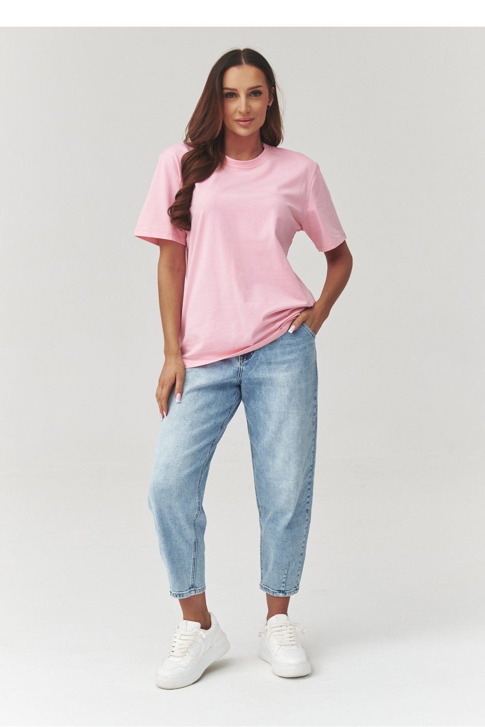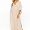 Long oversize dress with a tie at the back. Made of light and very airy material which makes it perfect for warm spring days and summer. On the front of the dress on the left side at the joining of fabrics there is a stylish tinsel, adding charm to the whole look. The dress has a deep V-shaped neckline, so that the worn jewelry will be visible and nicely exposed. The length of the sleeves reaches the elbow. Our long dress will work well during a romantic date with your beloved partner and also during an important family celebration.