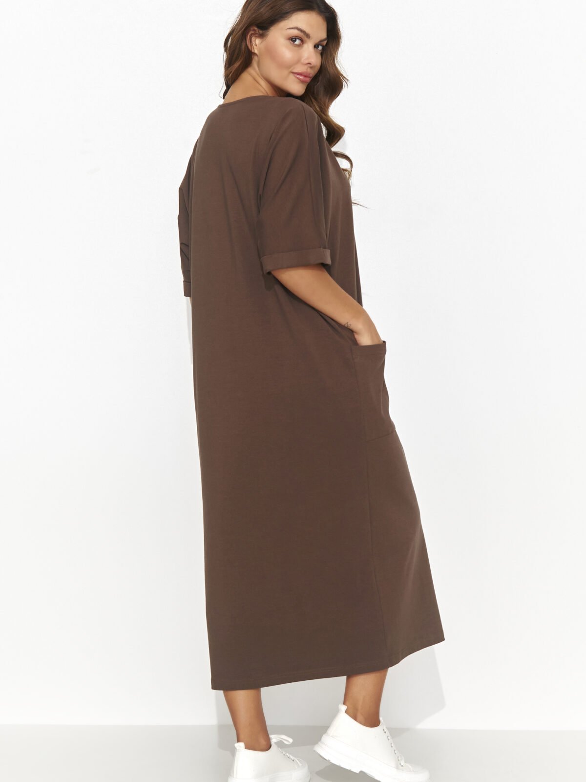A casual mini dress with a unique charm, with an elegant gold bling sewn on the front. The creation, with short sleeves and a casual cut, exudes girlish charm. The round neckline perfectly emphasizes the carefree look, adding lightness and casualness. Available in mocha, light beige, cream, chocolate and black, this dress is an ideal choice for everyday wear, adding a touch of style to everyday activities. It will work great at work, but also when meeting with friends. Everything is a matter of accessories. It’s a combination of comfort, elegance and girly finesse, and a very comfortable everyday style.