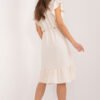 An everyday summer dress that will perfectly accentuate your feminine charm and provide comfort on a daily basis. Made of smooth polyester, this model is the perfect choice for warm days, providing freedom of movement and lightweight wear. Its flared cut gives the dress a light and airy feel, making every movement an extremely subtle dance. The asymmetrical cut, where the back of the dress is slightly longer, adds a unique character and elegance. The dress has short sleeves in the form of a ruffle, which add to its delicacy and girlish charm. The round neckline is versatile and goes well with a variety of accessories. Equipped with a tie belt, which emphasizes the waist and gives the dress a unique charm. In addition, a ruffle is placed at the bottom of the dress, which gives it subtlety and lightness. The length of the dress reaches before the knee, making it a perfect choice for a variety of occasions, from meetings with friends to everyday duties. Its simplicity and elegance make it a dress that is sure to become a favorite in your closet for summer days.