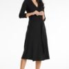 A midi dress with an envelope-shaped, fitted top and an overlapping bottom. This model has a belt to tie at the waist and 3/4 sleeves. It is a proposal for a date but also for a family gathering.