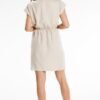 A simple mini dress with an elastic waistband for a flattering fit. It features short sleeves and a boat neckline. Additional features include slip pockets. It is an option for warm summer days.