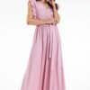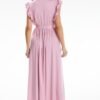 A maxi dress with an envelope neckline and an elastic waistband. It has ruffles at the shoulders and a belt to tie at the waist. It is the best choice for summer. You can wear it for a walk on the beach, going out on a date or meeting friends in the city.