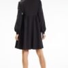 Mini dress on a stand-up collar with a deep neckline. It has long sleeves with cuffs fastened with press studs. The model is slightly fitted at the top and flared at the bottom. The proposal is ideal for christenings, birthdays or dates.