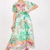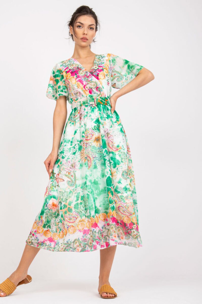 This dress is the essence of everyday elegance, combining comfort and style. Featuring a colorful print, it adds fun and energy to her look, perfectly matching any occasion. Its flared cut makes it extremely feminine and suitable for both social gatherings and work. Made of polyester, the dress is easy to care for and maintain, while keeping its perfect look for a long time. Its midi length gives it a versatile character that can be easily adapted to different occasions. Short sleeves and a heart neckline, with an envelope cut, add subtlety and feminine elegance to the dress, emphasizing the delicacy of the silhouette. In addition, the dress has a lining, which provides additional wearing comfort and a better fit to the body. To accentuate the waist and add extra flair to the dress, a belt in the same color as the print is included. With its combination of style, comfort and functionality, this dress becomes an indispensable closet item that will make every day full of confidence and elegance.