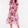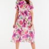 Chiffon dress with elastic lining, adjustable at the waist with a belt, slightly flared at the bottom.