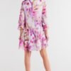 Loose chiffon dress with elastic lining, with two ruffles at the bottom and small ruffles at the sleeves.