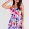 Short dress made of chiffon on elastic lining, the whole neckline decorated with a small frill. Dress on thin straps, sewn into the waist elastic to fit the figure.