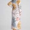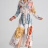 Maxi shirt dress with a collar. Decorative flaps on the bust line. Long sleeves finished with buttoned cuffs. Button-up dress, tied at the waist. Side slits. Dress without pockets and lining.