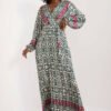 This maxi dress with colorful print is an ideal choice for various occasions, both casual and formal. Made of predominantly polyester, it is durable and comfortable to wear. The dress features an envelope neckline, which adds to its elegance and femininity. The flared cut provides freedom of movement and a stylish look, while the buff, long sleeve adds sophistication. The dress is equipped with a tie belt that accentuates the waist, giving the silhouette a beautiful shape. The colorful print makes the dress unique and eye-catching, perfect for a variety of occasions.