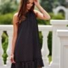 The Mila dress is made of a pleasant fabric with tiny peas, which add to its girlish charm. The dress features a halter neckline, which reveals and emphasizes the shoulders. The bottom of the dress is finished with a single ruffle, which adds lightness and a feminine touch. It fastens at the back with two, decorative buttons fixed at neck level. The dress comes with a belt with a decorative rose, which allows it to be worn in two ways, free-falling without a belt or tied at the waist. The Mila dress is an excellent choice for holiday events. Paired with elegant stilettos, the dress will look great at baptisms, communions and weddings. When you match it with sneakers or comfortable openwork flip-flops you will create an extremely girly, everyday styling that will make you stand out from the crowd, while providing comfort and convenience. The product is made and sewn in Poland.