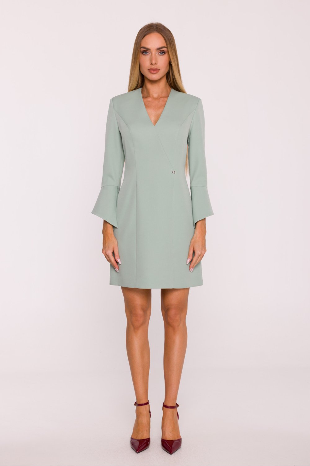 Mini dress made of cotton fabric, perfect for everyday and casual occasions. Cut at the waist, it emphasizes the silhouette, and long sleeves with a decorative fold on the shoulder add character to it. There is a hidden zipper at the back of the dress, which ensures comfortable wearing. The model is unlined, light, and airy. Designed and sewn in Poland, it guarantees high quality.