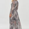 A long printed dress made of light, flowing material that gives it an elegant and romantic look. The dress pattern is a complex blend of plant, animal and abstract motifs in dominant colors of black, white, beige, brown and shades of orange. The pattern is intricate and original, adding a distinctive style to the creation. The model has a slightly fitted top that emphasizes the waist, while the bottom is flared, adding lightness and movement. The finishing of the dress is subtle, and the material is semi-transparent, emphasizing its delicacy. The dress has a viscose lining that discreetly covers strategic areas and provides comfort while wearing. When combined with heavy ankle boots, it creates a contrast with the dress’s subtlety, giving the whole outfit a slightly more casual look. The dress is perfect for autumn or winter evenings due to its warm colors and long sleeves. The creation is available in five variants, differing in color and pattern.