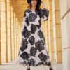 Ariela is a long dress made of chiffon material, which beautifully lends itself to movement. Interesting patterns add to its originality and uniqueness. The dress has long, semi-sheer sleeves, which create a buff effect. The V-shaped neckline beautifully accentuates the neckline and neckline, while the sewn-in elastic waistband guarantees an hourglass effect. The dress has a lining that prevents it from showing through. Ariela dress is a suitable choice for various occasions. With the right accessories, the creation is perfect for formal and everyday outings. The long, patterned Ariela dress will go well with black suede boots and a small shoulder bag. The product is made and sewn in Poland.