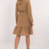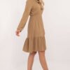 An everyday dress with a flared cut, ideal for both casual and work wear. Made from a blend of polyester and elastane, it offers comfort and freedom of movement, while looking elegant at the same time. The varied texture of the material gives it originality, drawing the eye with subtle details. The dress reaches before the knee, which makes it feminine and versatile. Decorated at the bottom with a ruffle, it adds lightness and movement to the styling. The tied neckline and long sleeves give it a stylish and comfortable character, ideal for various everyday occasions.