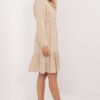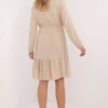 An everyday dress with a flared cut, ideal for both casual and work wear. Made from a blend of polyester and elastane, it offers comfort and freedom of movement, while looking elegant at the same time. The varied texture of the material gives it originality, drawing the eye with subtle details. The dress reaches before the knee, which makes it feminine and versatile. Decorated at the bottom with a ruffle, it adds lightness and movement to the styling. The tied neckline and long sleeves give it a stylish and comfortable character, ideal for various everyday occasions.