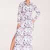 Maxi dress buttoned up. Dress with long sleeves and a collar. Made of flowing material with side slits. Tied at the waist with a narrow belt.