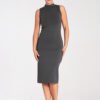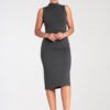 Fitted sleeveless midi dress with a stand-up collar. Fastened at the back with a covered zipper.