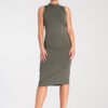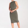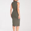 Fitted sleeveless midi dress with a stand-up collar. Fastened at the back with a covered zipper.