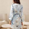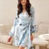 Mini dress with long sleeves. The top is wrap, and the bottom is slightly flared. It does not have a lining, it is fastened with a double tie at the waist.