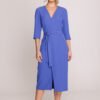 Elegant and feminine midi dress with a fitted cut that beautifully accentuates the silhouette. The top with a V-neckline, partially lined, adds a subtle lightness, while the 3/4 sleeves give a classic character. The bottom with a wrap motif provides freedom of movement and slims the figure. An elastic band is sewn at the back of the waist to adjust to the figure, and an additional tied belt allows you to emphasize the waist according to your preferences. The dress is fastened with a concealed zipper on the side, ensuring an aesthetic finish. The model is designed and sewn in Poland, with attention to every detail. Perfect for special occasions and elegant outings.