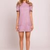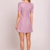 Charming mini dress in a trapeze cut, made of elegant fabric that beautifully drapes on the silhouette. The model features short puffy sleeves, giving it a light and romantic character. The front has decorative flaps with heart-shaped gold buttons, adding a unique charm to it. The dress is fastened at the back with a concealed zipper, ensuring comfort and an aesthetic finish. The lack of lining makes it light and airy. The whole design and sewing process took place in Poland with attention to every detail.