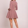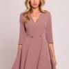 Charming mini dress made of smooth fabric, combining lightness and feminine style. The flared bottom with wedges gives it airiness and elegance, and elbow-length sleeves provide a subtle finish. The deep V-shaped neckline beautifully highlights the neck and décolleté. Two decorative buttons at the waist add a unique accent and emphasize the silhouette. The dress is fastened at the back with a hidden zipper, ensuring a perfect fit. The lack of lining makes it light and comfortable. Designed and made in Poland with attention to every detail.