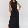 Stylish maxi dress made of lightweight viscose knit is an ideal proposal for spring and summer days. It is characterized by a loose cut and a comfortable tie at the waist, which adds femininity and allows the dress to be adjusted to the figure, providing comfort throughout the day. The round neckline ensures versatility and the lack of sleeves makes it a perfect option for warmer days. The maxi length adds class to it, while the side slit adds coquettishness and lightness, introducing a dynamic and modern accent to the styling. The dress has a classic and minimalist cut, which will work perfectly in both everyday and more formal outfits. It is a versatile option that fits different occasions. Pair it with sneakers for everyday wear or elegant sandals, making it an ideal choice for city outings, walks, or weekend relaxation.