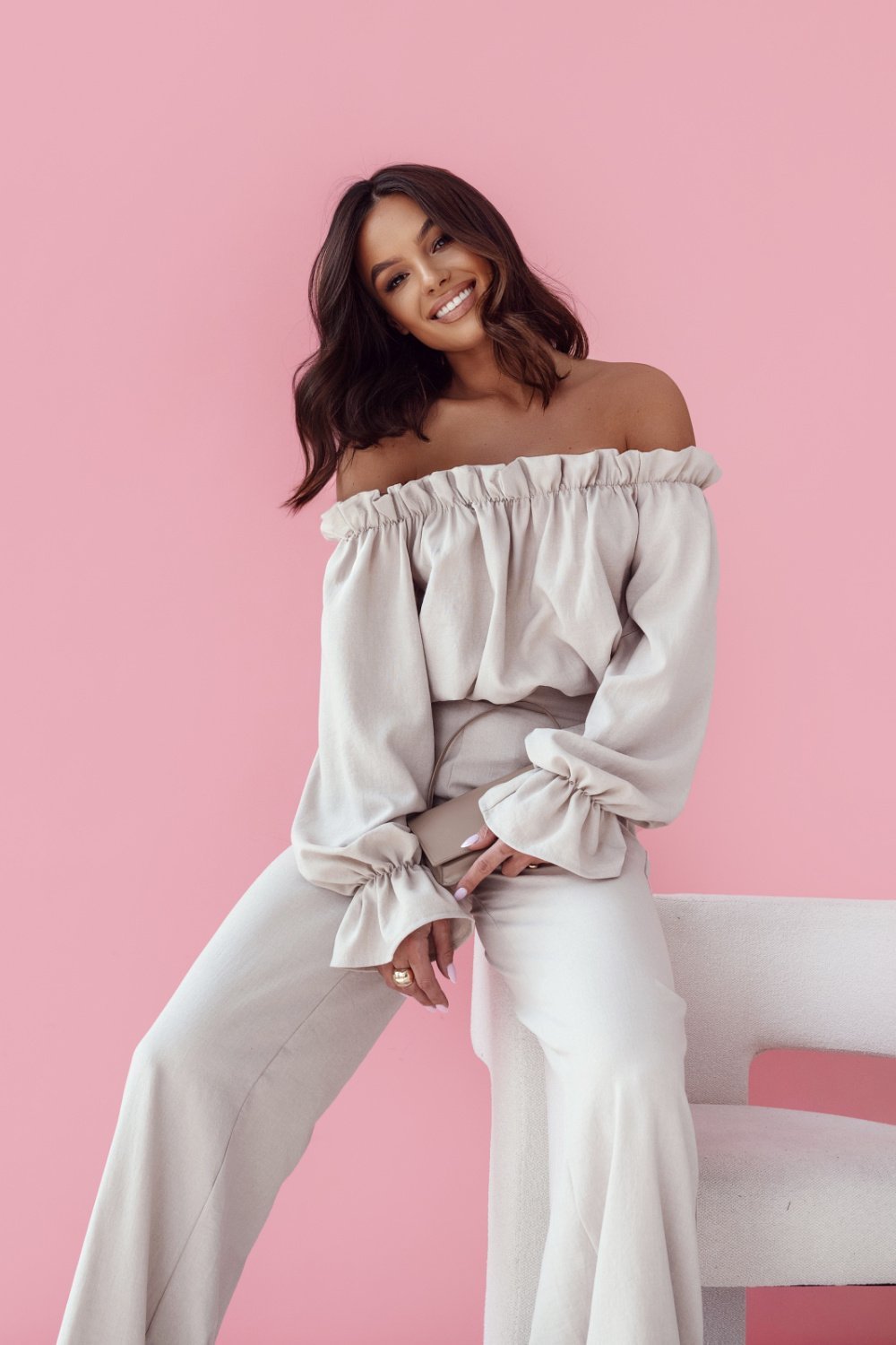 Stylish and feminine mini dress, perfect for warm days. Made of pleasant to the touch linen with viscose, it provides comfort and breathability. The sleeveless cut beautifully exposes the arms, while the V-neck subtly emphasizes the neck and décolletage. There are decorative buttons on the front and sleeves, adding elegance and a unique character to the dress. It is a perfect choice for both everyday wear and special occasions, combining comfort with a fashionable, timeless style.