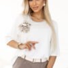 This stylish ecru blouse is a combination of classic form with modern detail. Smooth, elastic material fits perfectly on the silhouette and provides comfort throughout the day. A subtle application in the form of a fabric flower on the shoulder catches the eye and adds character to the styling. A looser cut and 1/2 sleeve make the blouse an ideal choice for women looking for comfortable yet elegant solutions. It pairs well with both elegant trousers and a classic skirt.