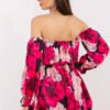 Stylish summer dress with a flared cut, perfect for everyday and special occasions. Made from a blend of polyester, viscose, and elastane, it provides comfort and lightness, perfect for warmer days. The floral pattern adds feminine charm and freshness, creating a unique, romantic look. The dress is mini-length, with long puffy sleeves and an off-the-shoulder neckline that beautifully highlights the shoulders. An additional advantage is the buttoned belt, which allows you to accentuate the waist and adjust the dress to the silhouette. The inside of the dress is finished with a lining, which increases wearing comfort. The lack of fastening makes the dress easy to put on. Perfect for summer days, both for everyday wear and more formal events, combining comfort with elegance.