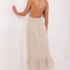 Add a bit of summer casualness and feminine charm to your wardrobe with this flared boho-style dress. Made of breathable cotton with elastane, it guarantees comfort and freedom of movement even on hot days. The midi-length dress with tied straps worn around the neck beautifully showcases the arms and back. The V-neck subtly accentuates the feminine silhouette, and the decorative lace on the front adds a romantic touch. The smooth fabric and ruffle at the bottom make the dress look light and airy. It’s the perfect choice for everyday summer occasions like a walk, the beach, or a meeting with friends. Boho style at its best, in a feminine version. The dress length given in the table is without tying. The length of the tie is 72 cm.