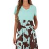 This summer, flared dress is a combination of comfort, style, and original design. Made of breathable cotton and elastane blend, it will be perfect for everyday wear, both in the city and during summer vacation. The top of the dress is made of ribbed material, which subtly fits the silhouette, emphasizing its advantages. The sweetheart neckline and short sleeves add lightness and feminine charm to the whole. The bottom of the dress is adorned with an original animal motif, which adds character and breaks the classic, smooth top. The knee-length model is not only stylish but also functional, it has practical pockets hidden in the side seams, which increase wearing comfort. This dress is perfect for everyday outings, combining simplicity with a hint of wild accent, creating a unique proposition for women who value comfort and fashionable look.