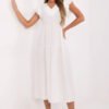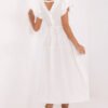 Stylish and feminine summer dress with a flared cut is a perfect proposition for everyday wear and work. Made of a light and breathable blend of viscose and nylon, it ensures comfort even on the hottest days. The midi length model beautifully shapes the silhouette, and the waist tie allows for subtle waist accentuation. The smooth fabric gives the dress a universal, elegant character, making it easy to match with different stylizations. The short ruffle sleeves add lightness and romantic charm, while the V-neck visually slims the neck and adds feminine charm. The dress is fastened with buttons at the back, which is a stylish detail and makes it easy to put on. It is the perfect choice for women who appreciate comfort, elegance, and functionality, both in their daily hustle and bustle and during quieter summer days.