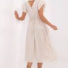 Stylish and feminine summer dress with a flared cut is a perfect choice for everyday wear and work. Made of a light and airy blend of viscose and nylon, it ensures comfortable wearing even on the hottest days. The midi-length model beautifully shapes the silhouette, and the tie at the waist allows for subtle waist accentuation. The smooth material gives the dress a universal, elegant character, making it easy to match with different stylizations. The short ruffle sleeves add lightness and romantic charm, while the V-neck visually slims the neck and adds feminine charm. The dress is buttoned at the back, which is a stylish detail and makes it easier to put on. It is an ideal choice for women who appreciate comfort, elegance, and functionality, both in everyday hustle and bustle and during quieter summer days.