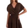 A light and airy muslin dress is the perfect choice for summer days. Made of natural cotton, it delights with comfort and the delicacy of the material. The flared cut beautifully drapes during movement, giving the silhouette lightness and subtle charm. The knee-length model features short sleeves and a feminine wrap neckline, which visually elongates the neck and accentuates the bust. Pleats at the waist gently emphasize the waist, creating a graceful figure line, and the lack of fastening makes the dress easy to put on and extremely comfortable for everyday wear. The smooth pattern and classic cut make it a versatile wardrobe piece, perfect for a walk, shopping, or meeting friends.