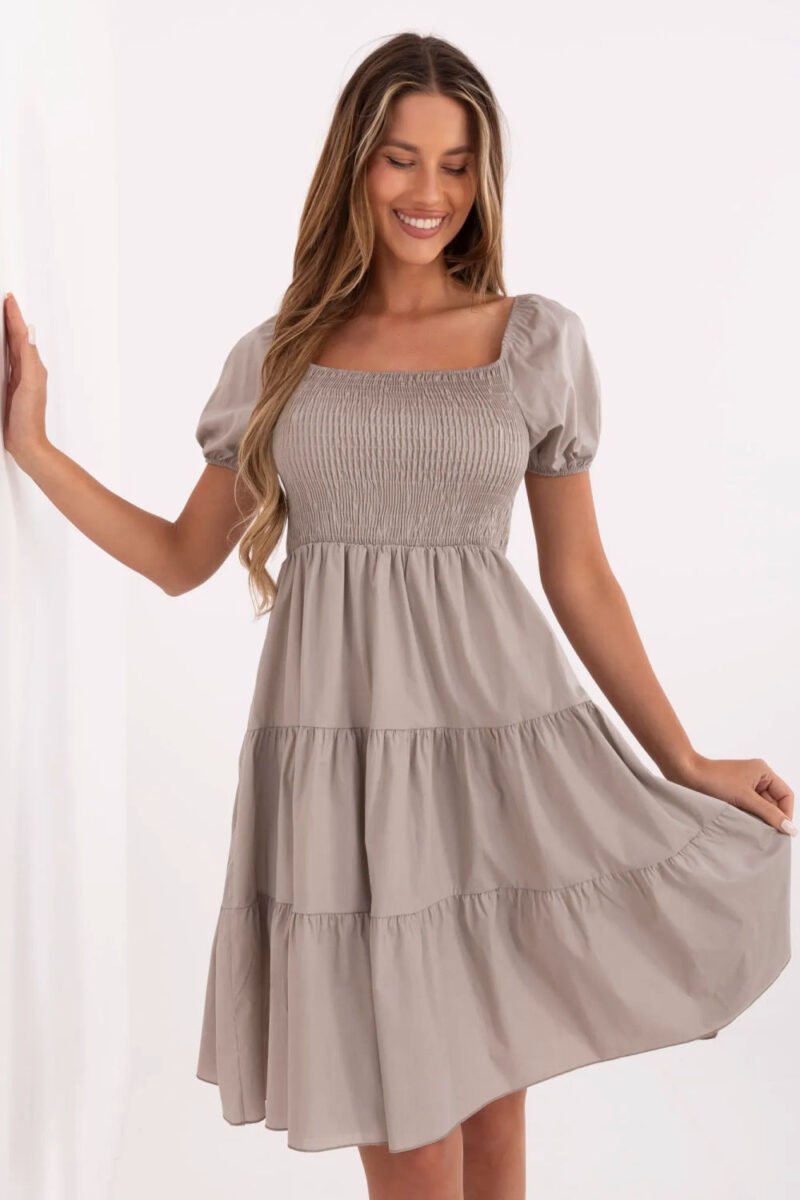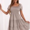 A summer dress with a flared cut is the perfect choice for everyday styling on warm days. Made of soft, breathable cotton fabric with added elastane, it provides comfort and freedom of movement throughout the day. The model reaches below the knee, and its characteristic elements are a rectangular neckline and puffy short sleeves, which add a romantic charm to the whole look. The top part of the dress is decorated with pleats that emphasize the bust and add lightness to the styling. An additional decoration is the ruffle at the bottom of the dress, which beautifully flows in motion. The lack of fastening makes the model easy to put on and extremely comfortable to wear every day. The smooth fabric and feminine cut make the dress perfect for a walk, shopping, or meetings with friends.