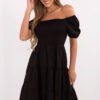 A summer dress with a flared cut is an ideal choice for everyday stylizations on warm days. Made of soft, breathable cotton fabric with a touch of elastane, it provides comfort and freedom of movement throughout the day. The model reaches below the knee, and its characteristic elements are a rectangular neckline and puffy short sleeves, adding a romantic charm to the whole look. The top part of the dress is decorated with gathers that emphasize the bust and give the styling a lightness. An additional decoration is a ruffle at the bottom of the dress, which beautifully ripples in motion. The lack of fastening makes the model easy to put on and extremely comfortable for everyday wear. The smooth material and feminine cut make the dress suitable for a walk, shopping, as well as meetings with friends.