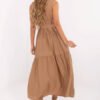Stylish and comfortable dress with a flared cut, which combines everyday casualness with a touch of elegance. Made of a breathable blend of viscose and nylon, it will work perfectly both at work and in everyday situations. A maxi length model, sleeveless, with a classic collar and button closure up to the waist. There is a tie belt at the waist, which subtly emphasizes the silhouette and allows you to adjust the dress to your figure. Additional charm is added by pockets with flaps at chest height, introducing a delicate utility style accent, and a wide ruffle at the bottom, giving lightness and feminine character. Thanks to its smooth pattern, the dress is a universal base for many stylizations, looks great with both sandals and classic ballerinas or espadrilles.