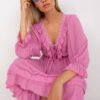 Summer boho dress with a flared cut is a feminine and stylish proposal for everyday wear and work. Made of a light combination of polyester and viscose, it provides comfort and freedom of movement. The mini length model delights with details: long sleeve finished with a flounce, a tie at the neckline decorated with a subtle flounce and lace, and the lower part of the dress finished with an impressive flounce. The smooth material emphasizes the delicate, romantic character of the styling. The dress has no fastening, which makes it easy to put on, and the sewn lining increases comfort and prevents transparency. Perfect for warm days in a boho style.