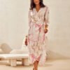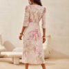 Mirella dress is an elegant proposition that combines feminine elegance with functional design. The midi-length model is made of light, pleasant to the touch fabric decorated with trendy, delicate patterns that add a subtle charm to the styling. The V-neckline visually elongates the neck and highlights the collarbones, while the perfectly tailored cut conceals any imperfections of the silhouette. Special attention is drawn to the double tie at the waist, which allows the dress to be perfectly fitted to the figure, shaping feminine curves and emphasizing proportions. The 3/4 length sleeves give the whole outfit lightness and make this style a perfect choice for both warmer days and transitional seasons. Mirella dress will work great as a styling for a wedding, reception, or any occasion when you want to look elegant and feel comfortable. Paired with classic pumps and jewelry, it will create a graceful, chic look that will surely attract attention. The product is designed and made in Poland.