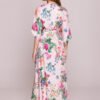 This airy dress is made of light, breathable viscose decorated with a delicate, floral pattern that adds a romantic character to it. The loose fit with a flared bottom and a tie at the waist allow for comfortable adjustment and emphasizing the silhouette. The V-neck subtly highlights the neck, while the loose elbow-length sleeves provide comfort and freedom of movement. The dress does not have a lining or pockets, which emphasizes its lightness and natural style. There is an eye-catching slit at the front, adding elegance and lightness to the overall look. Designed and sewn in Poland, perfect for warm days, both for everyday wear and special occasions.