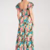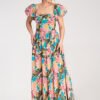 Maxi dress with a square neckline and short, puffy sleeves finished with elastic. The top is elastic, with gathers at the back, fitting the silhouette. The bottom is flared, made of three wide, gathered horizontal layers.